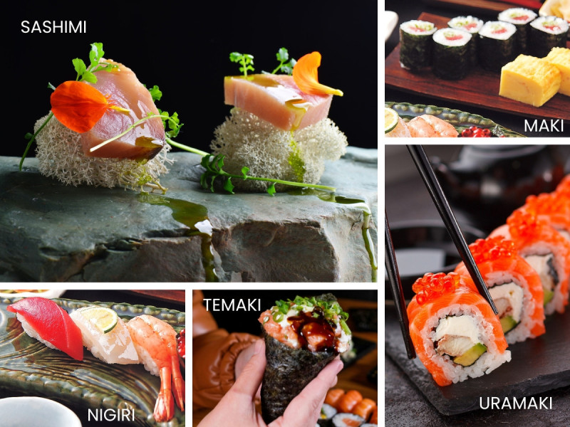 Základem je shari, tedy octová rýže, a k ní se přidávají ryby, mořské plody nebo jiné ingredience. Servíruje se několik druhů podle tvaru a způsobu přípravy.